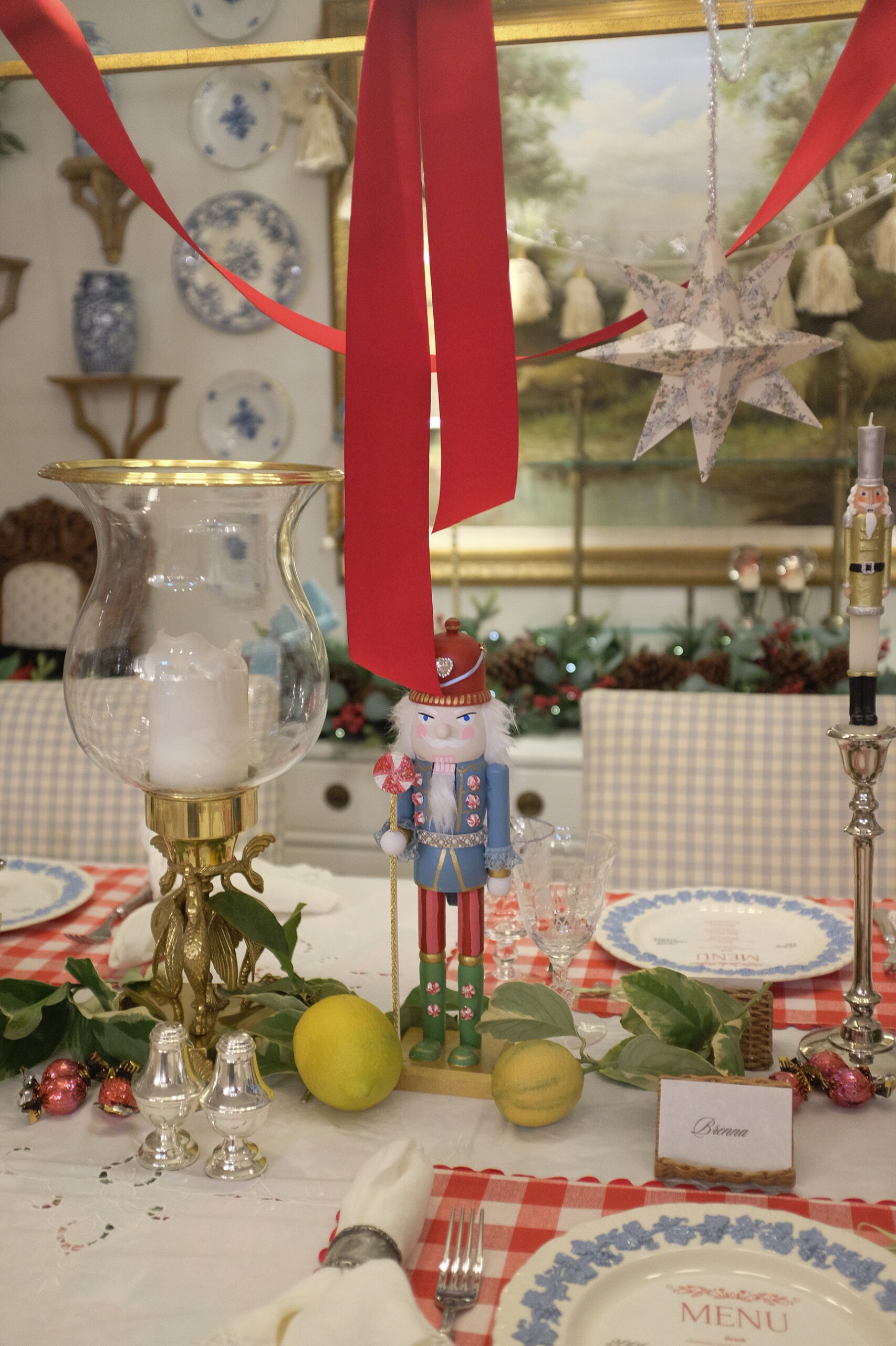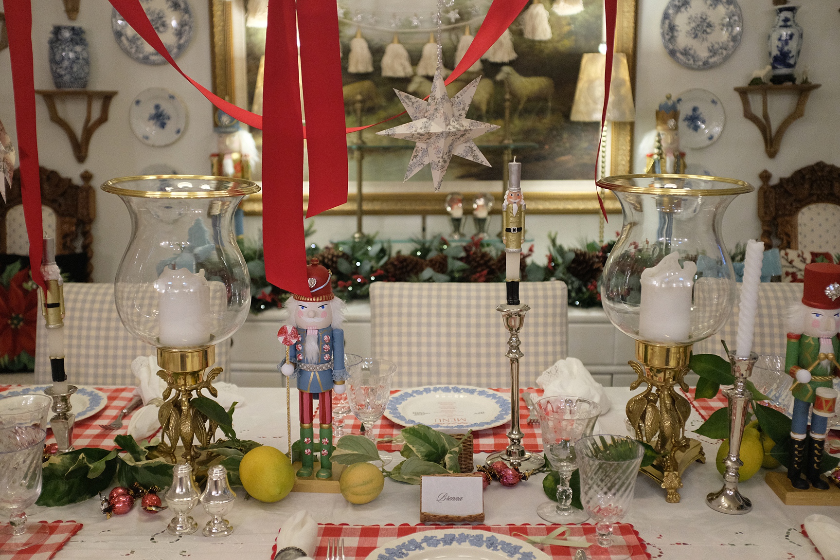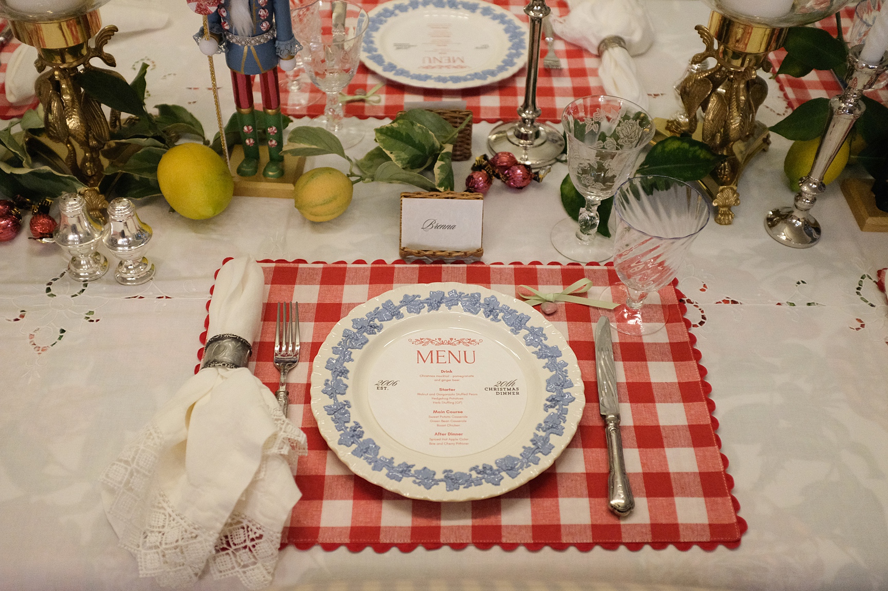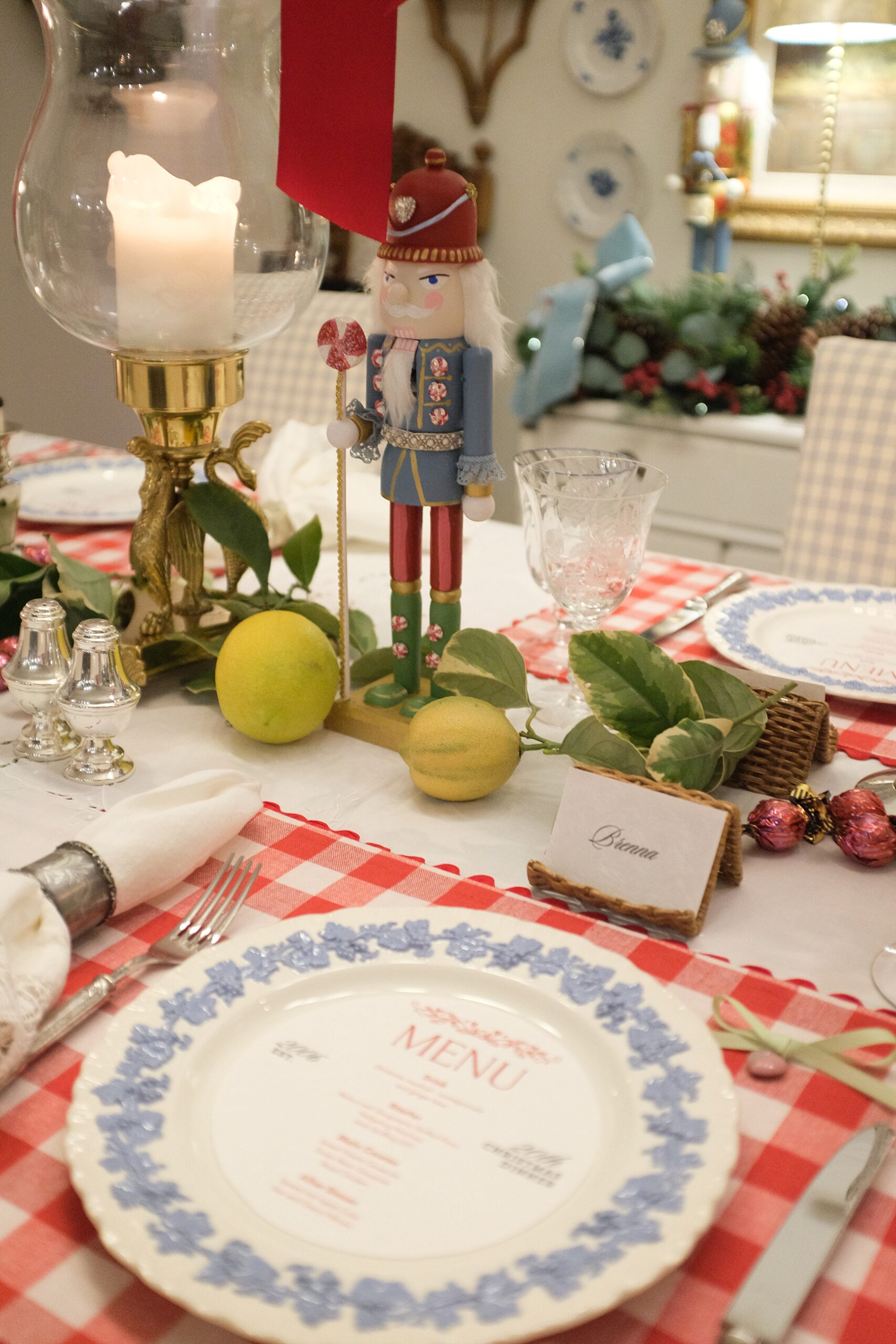 I used nutcrackers that I painted since I went on a nutcracker painting obsession after taking a painting class by a friend of mine earlier this month. I went to the backyard and clipped some lemon branches, which are very spiky! I wanted more of a cottage feel. I guess you could say little women, but perhaps not as crafty. I used my Thrifted Wedgwood plates and double-sided red gingham placemats. I’ve had for years from an old collaboration with the Home Depot.