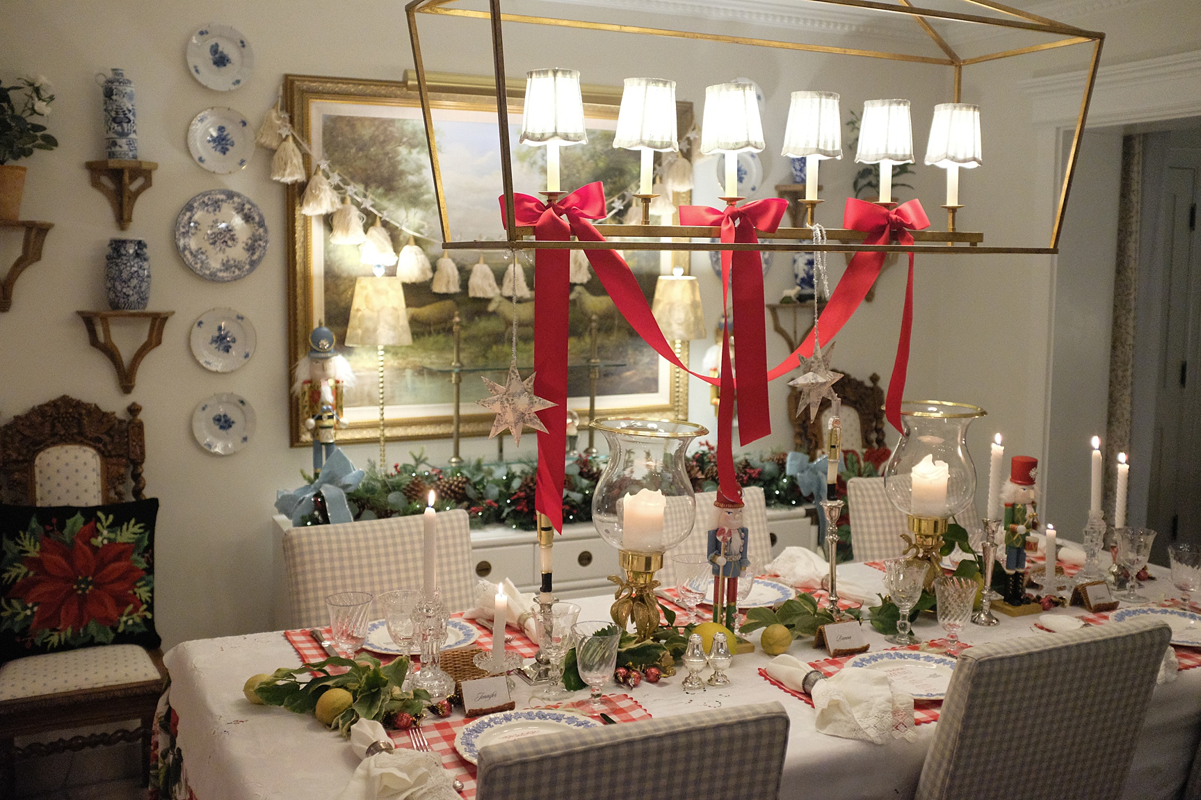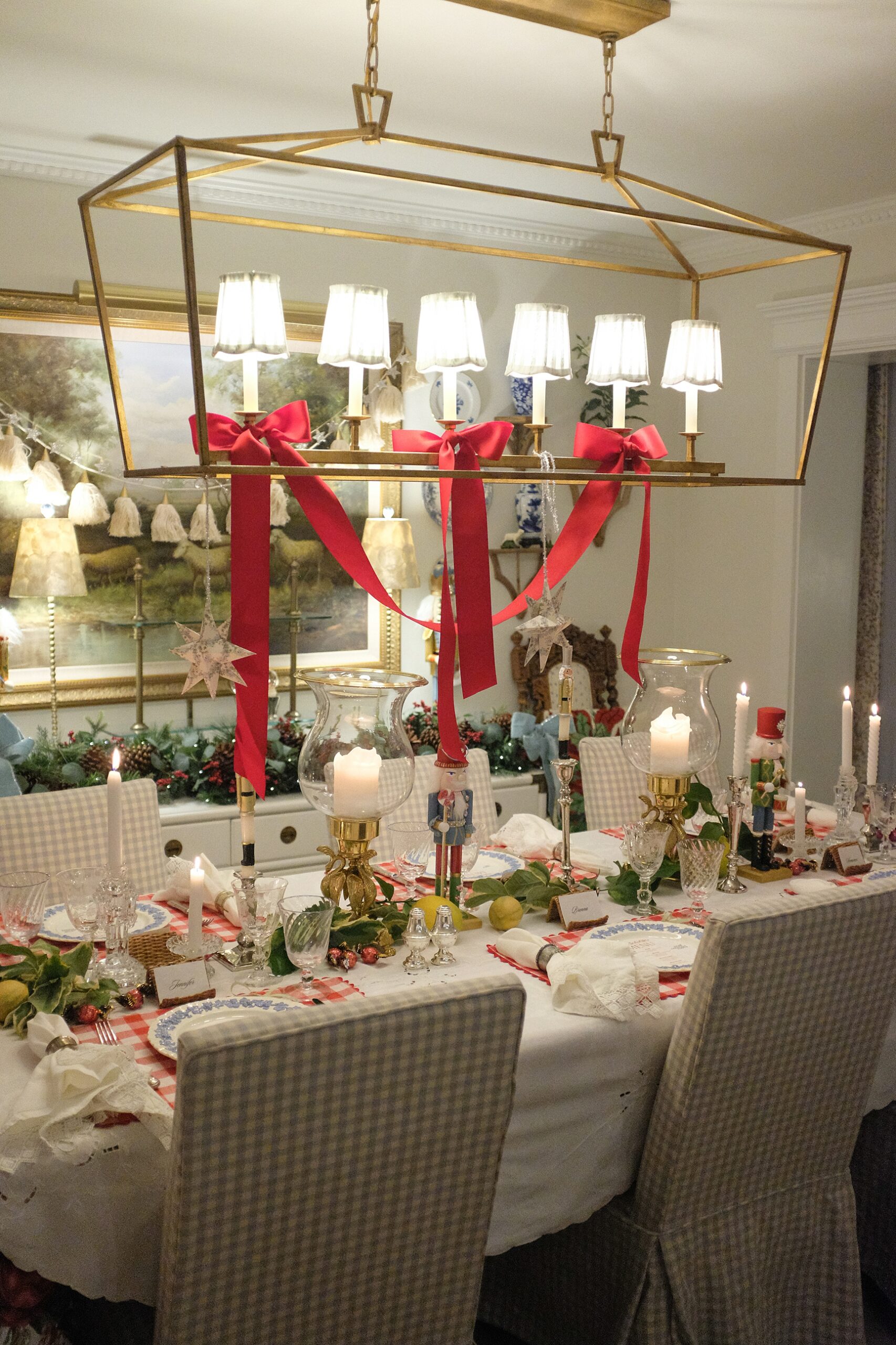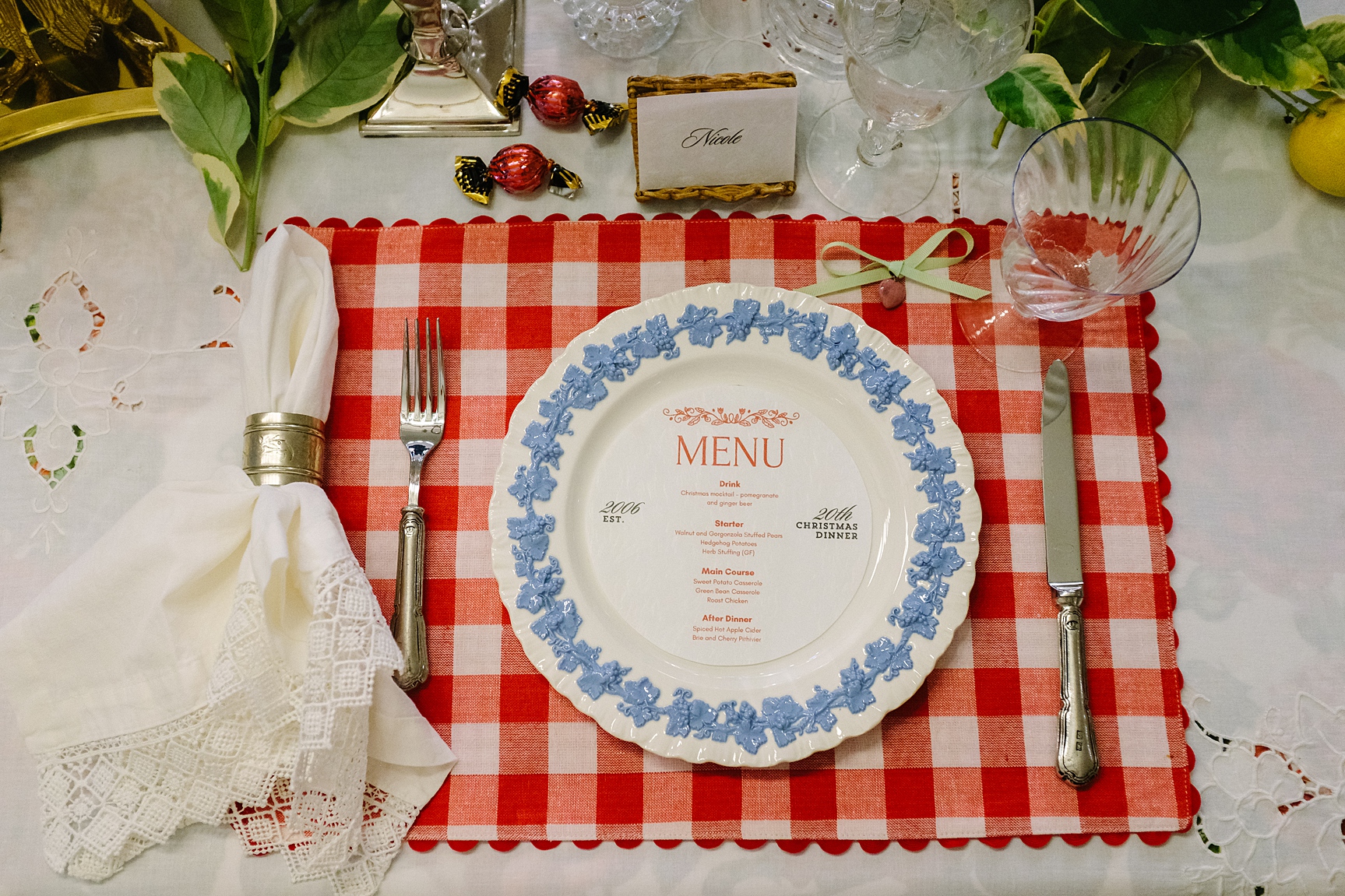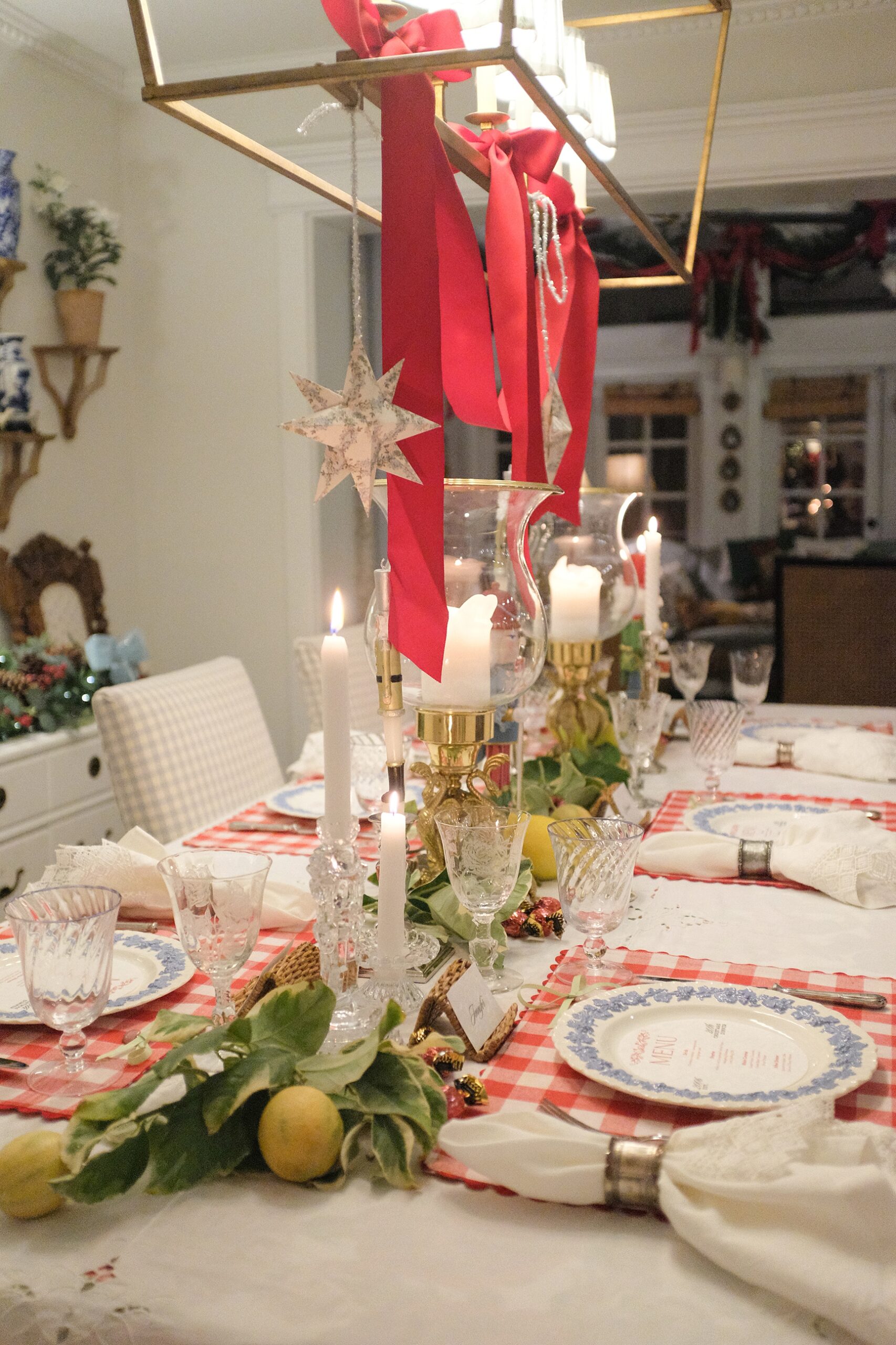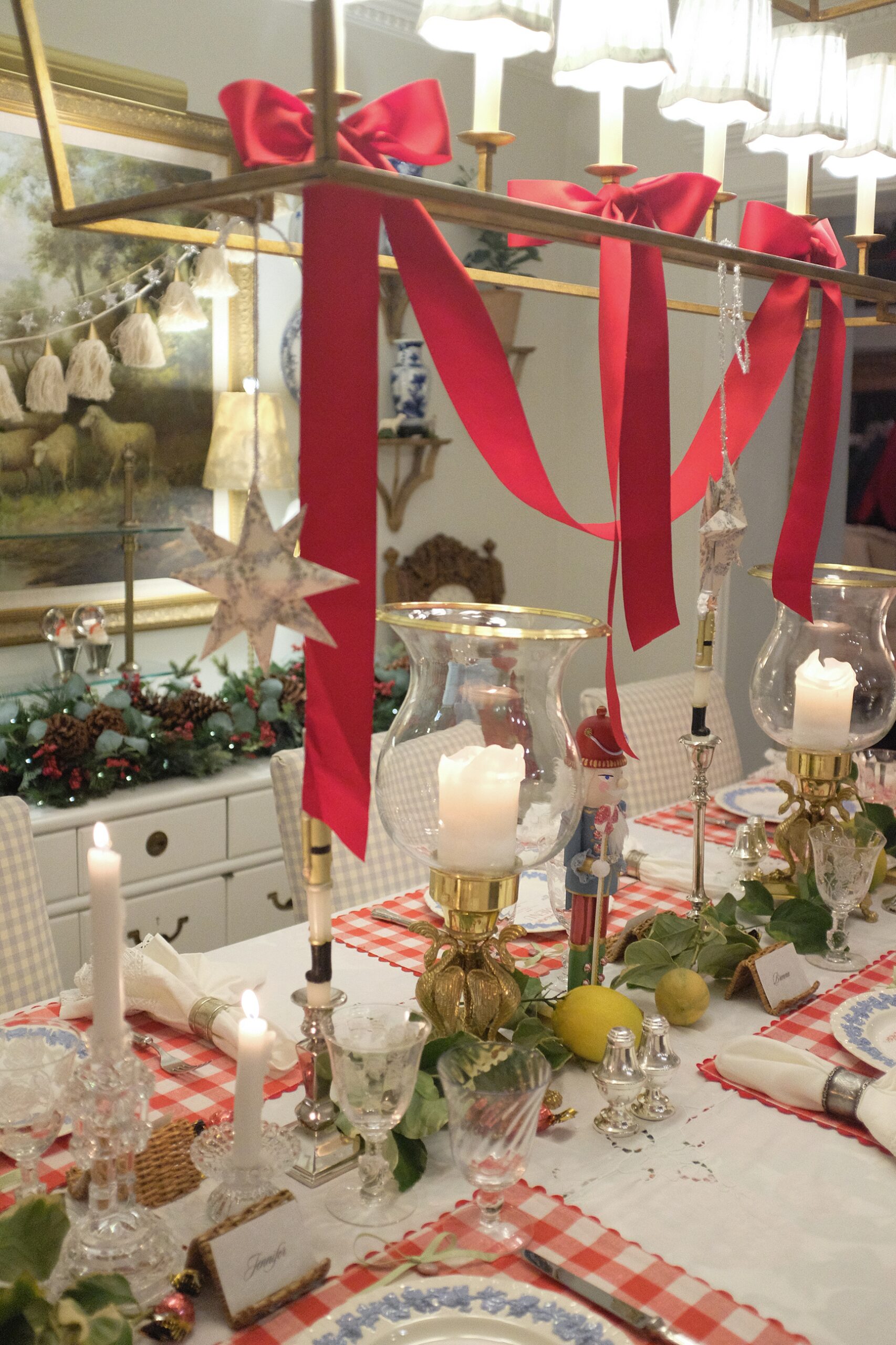 I used nutcrackers that I painted since I went on a nutcracker painting obsession after taking a painting class by a friend of mine earlier this month. I went to the backyard and clipped some lemon branches, which are very spiky! I wanted more of a cottage feel. I guess you could say little women, but perhaps not as crafty. I used my Thrifted Wedgwood plates and double-sided red gingham placemats. I’ve had for years from an old collaboration with the Home Depot.