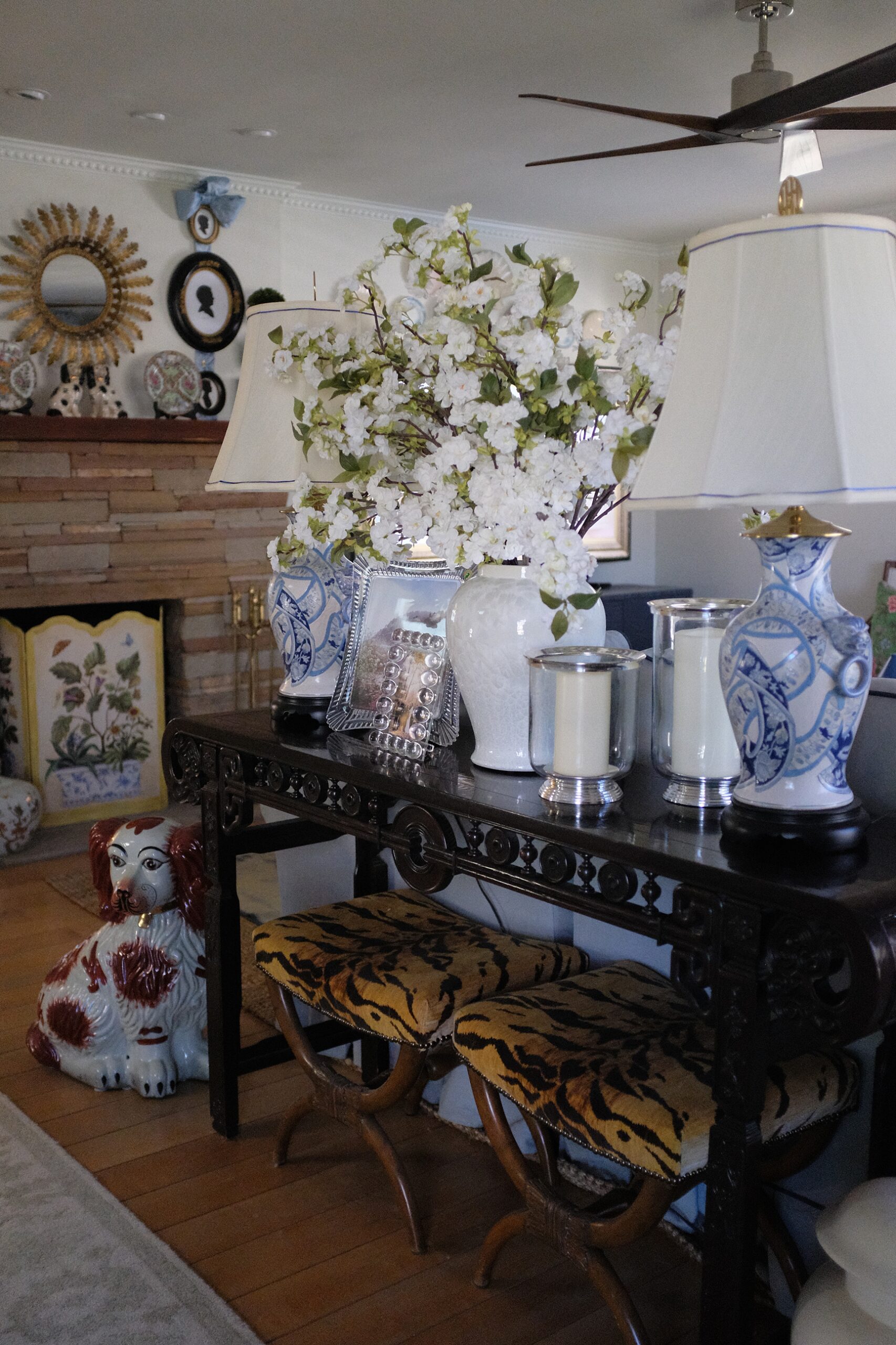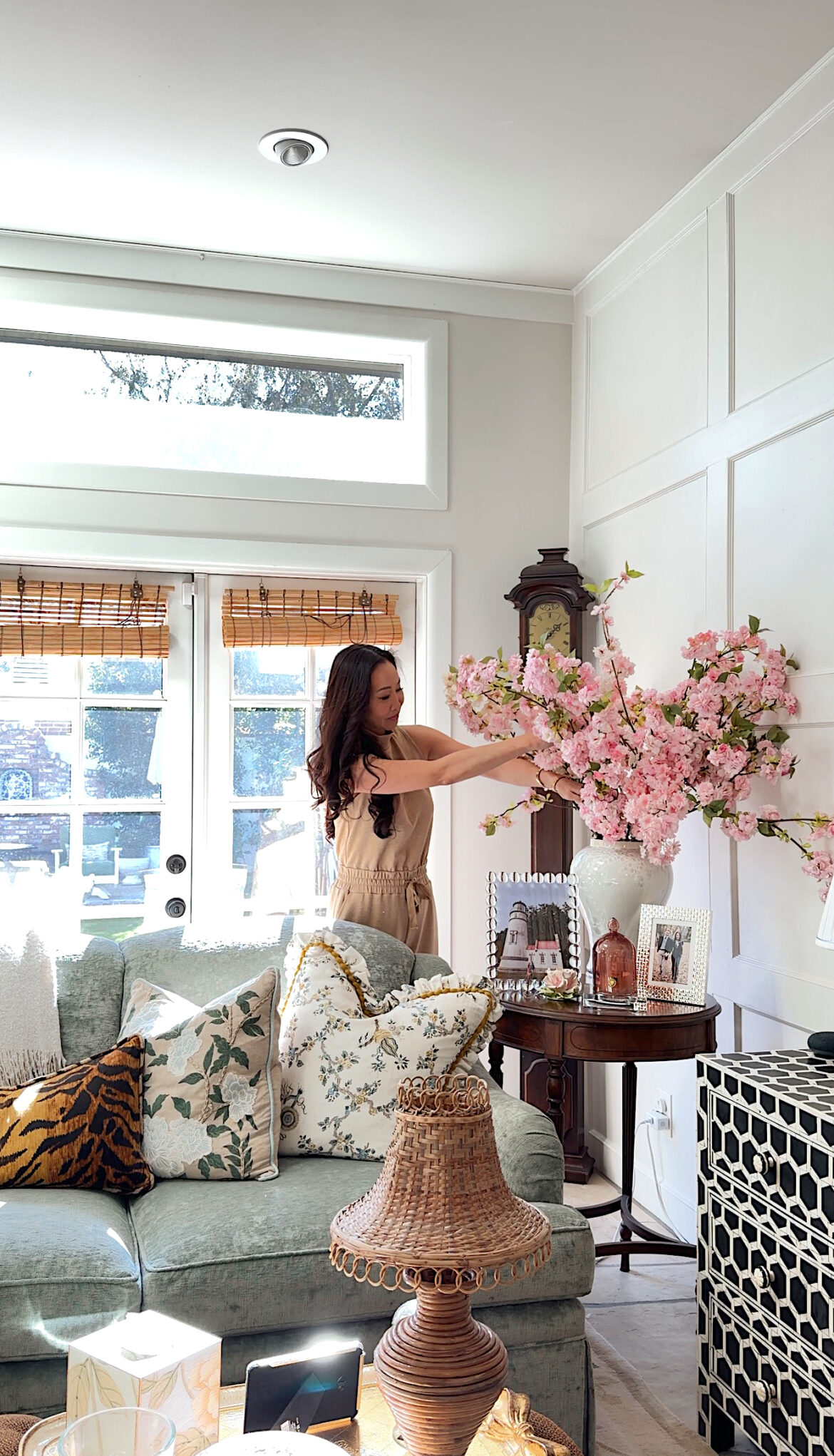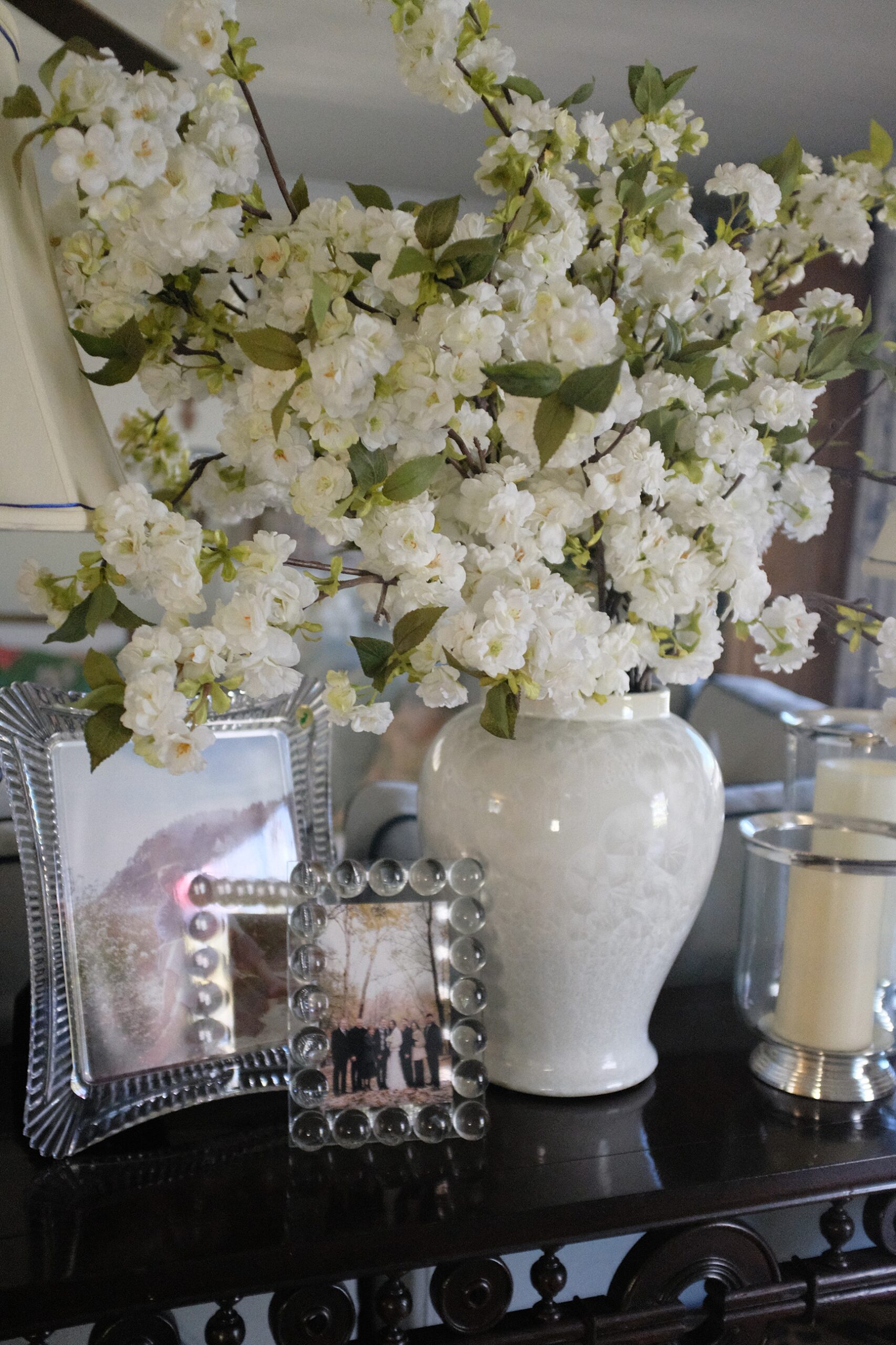 I have pink cherry blossoms from Alice Lane Home and Pottery Barn (currently on sale) which I only put out in spring. Faux florals are fine to me, as long as they are seasonal it seems more appropriate.