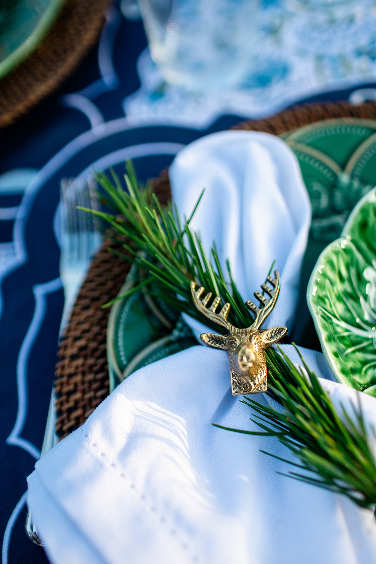When you’re hosting with a backdrop as breathtaking as Mt. Rainier, the key is to enhance — not compete. I also love layers. I used my placemats that are coated and custom embroidered I bought from Scottsdale Marketplace, layered with the Nito chargers. I love these woods dinner plates and I can use my cabbage bowls with them! The deer napkin rings are a thrift find and after asking for permission, cut some springs off an evergreen tree on the property. Texture! The hemstitch linen napkins are from Amazon. Flatware is so unique and though they look heavy, are a medium weight.