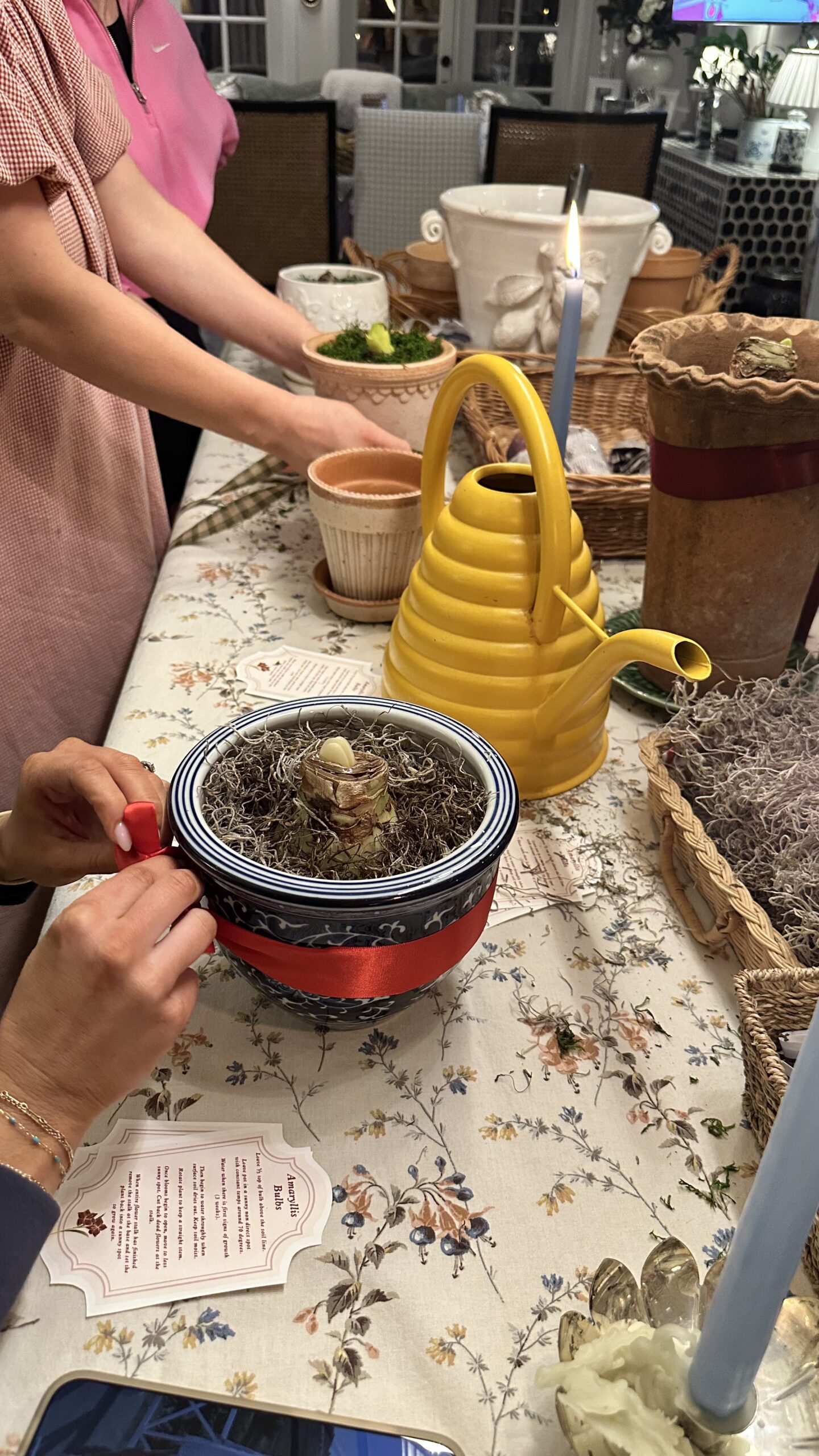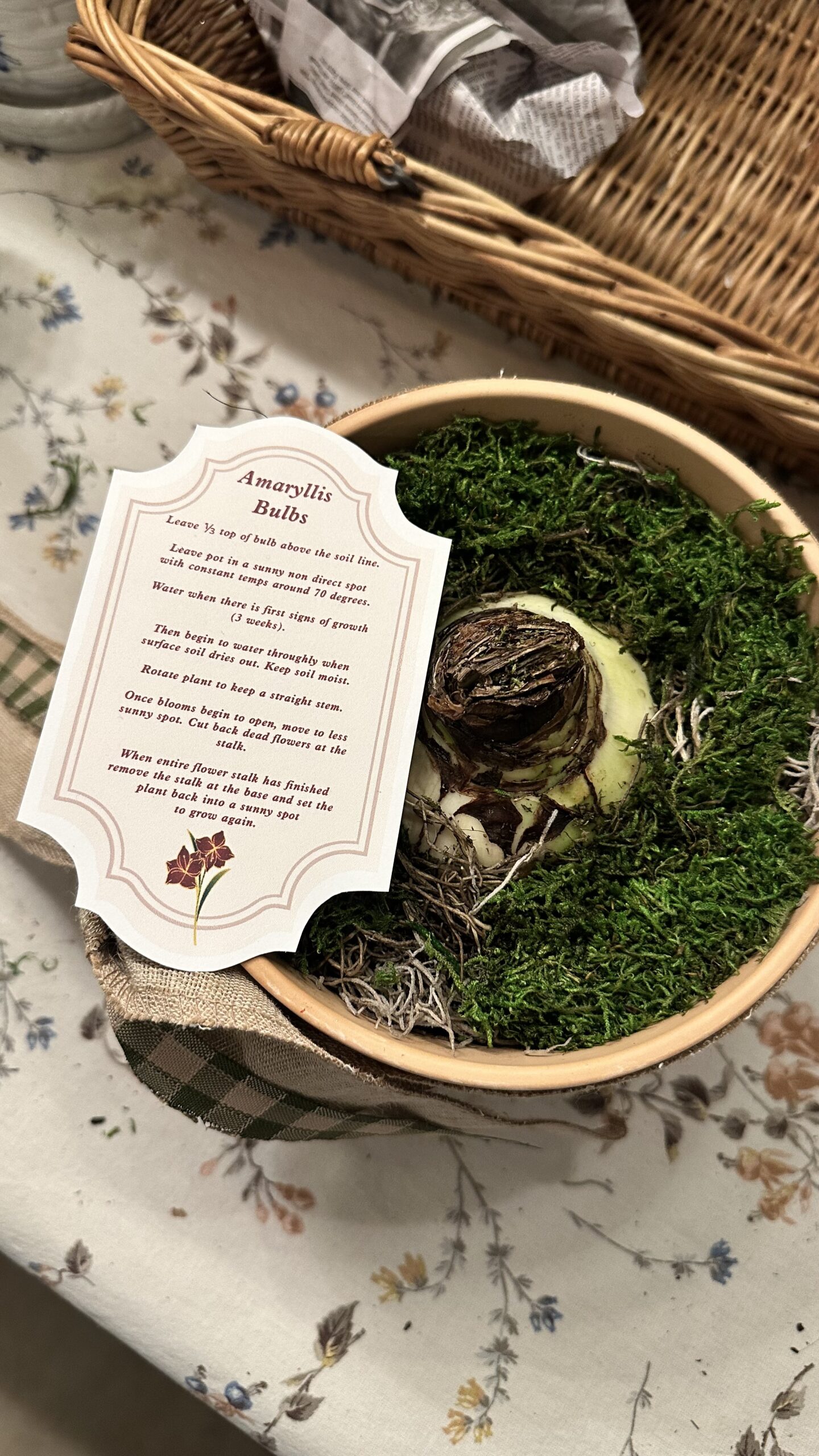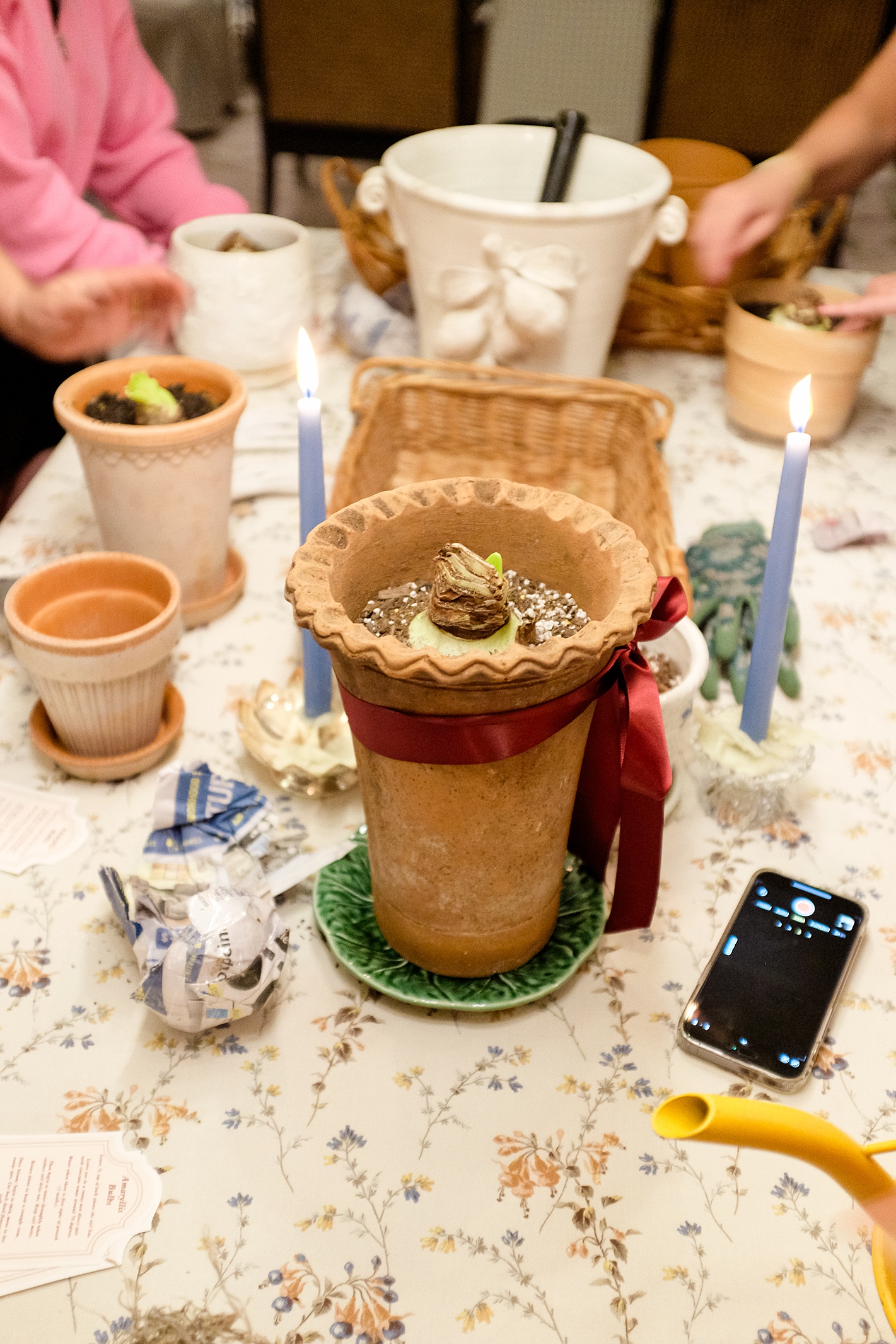 If you want to keep things simple, you can also provide small terra cotta pots. I like to plant one amaryllis bulb per pot, or four paperwhite bulbs together . Before everyone arrived, I prepped little kits — each wrapped with a bulb, and a note about how to care for it once planted.