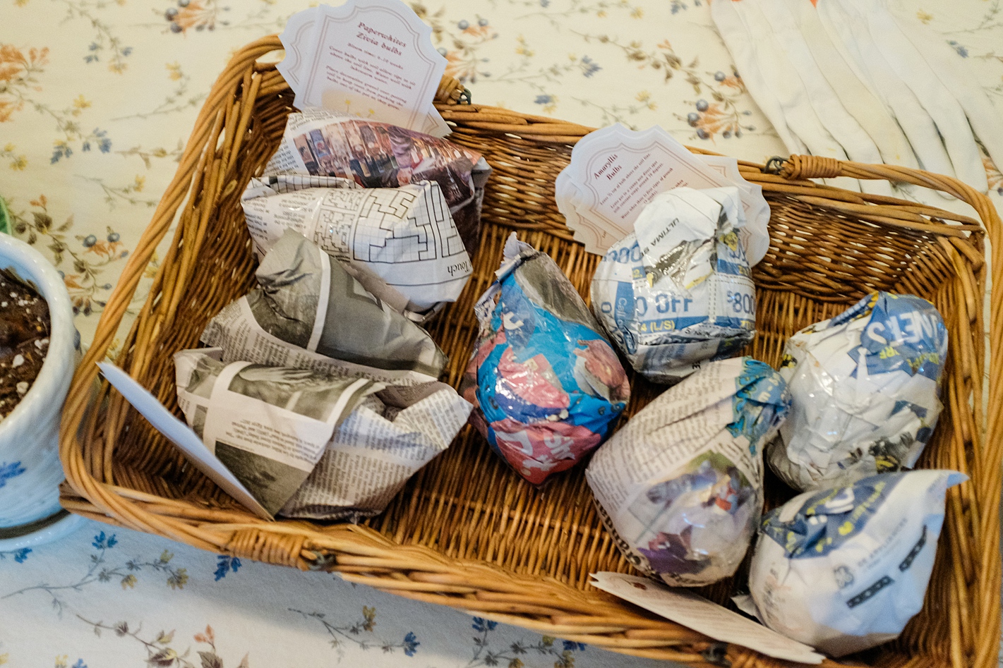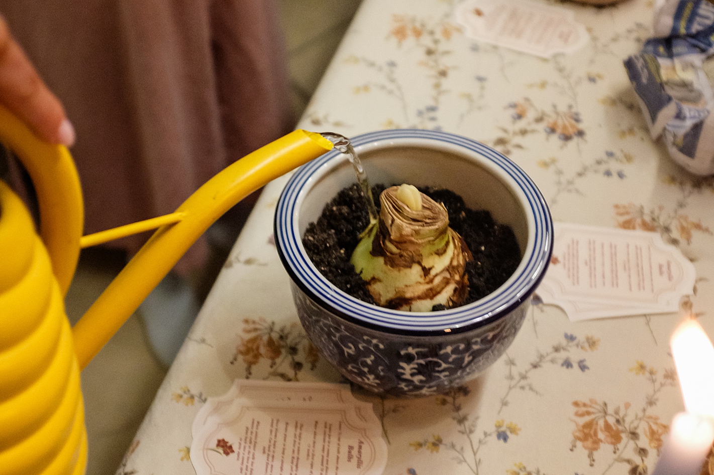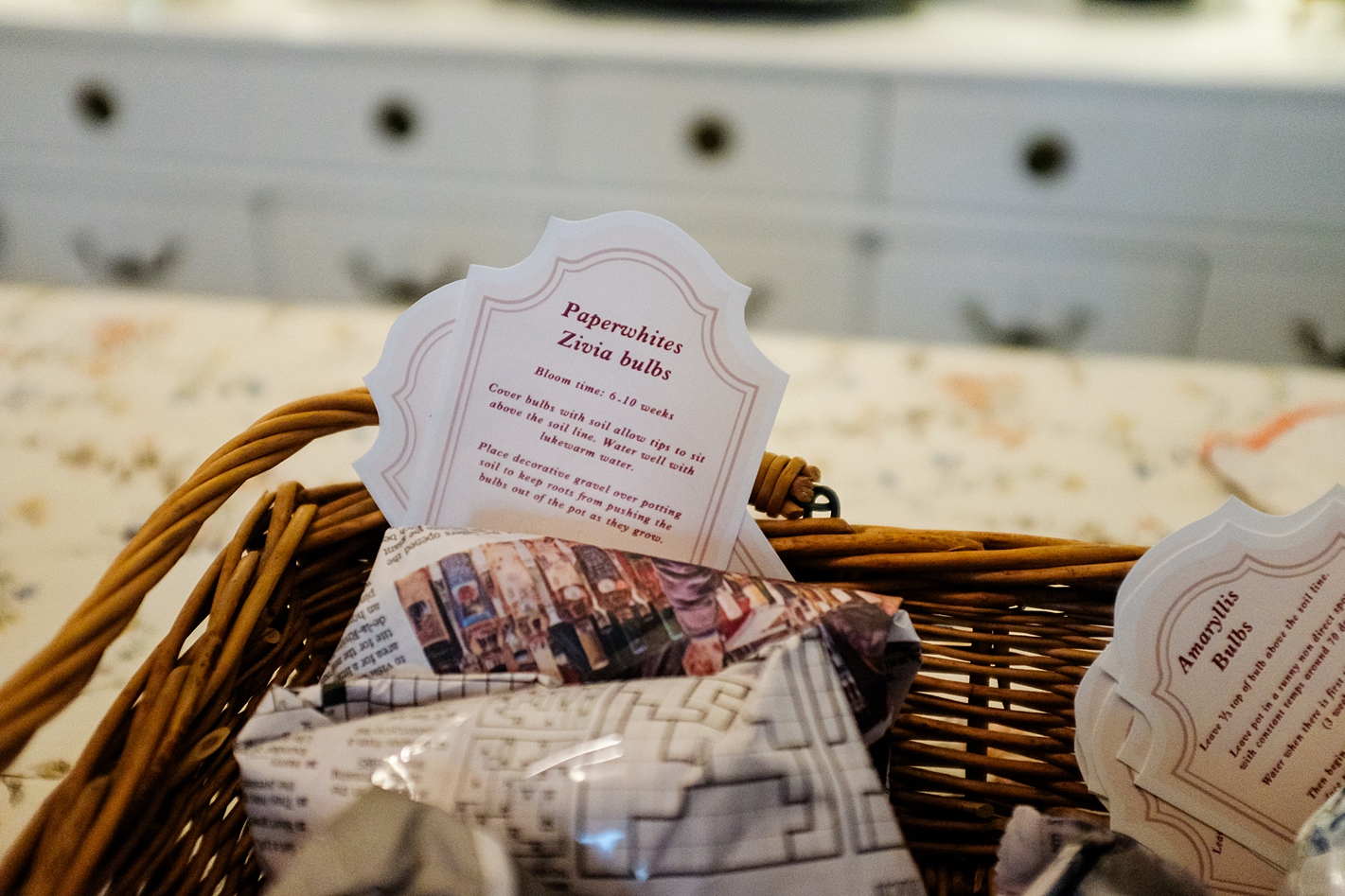 If you want to keep things simple, you can also provide small terra cotta pots. I like to plant one amaryllis bulb per pot, or four paperwhite bulbs together . Before everyone arrived, I prepped little kits — each wrapped with a bulb, and a note about how to care for it once planted.