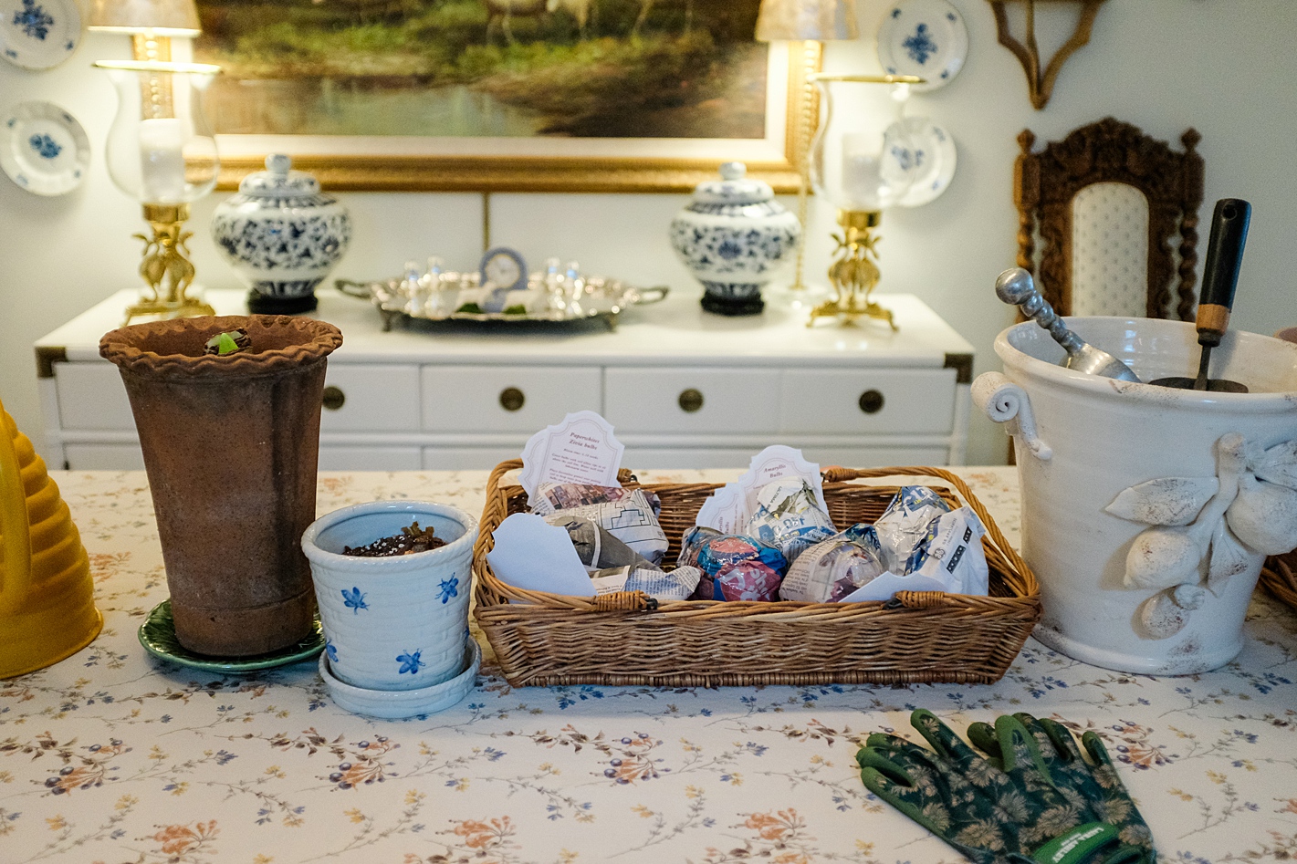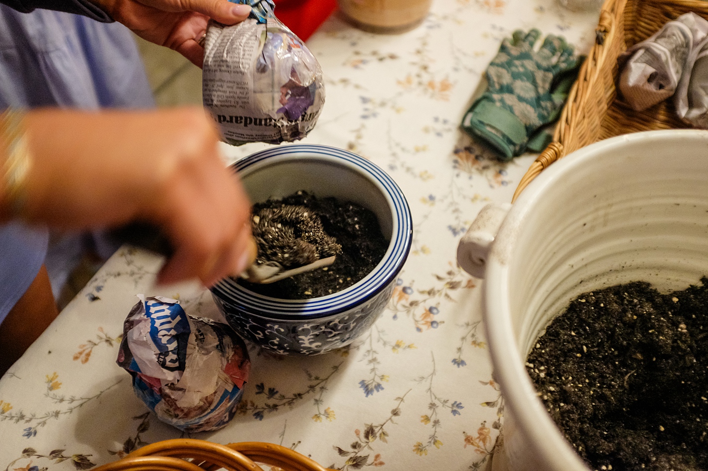 For a gathering like this, you don’t need much. I cleared off the dining table and covered it with a tablecloth to make cleanup easy. A few candles flickered in the background, and I placed bowls of the bulbs with instructions, indoor potting mix (this order of two bags would be enough for about a dozen guests), gardening gloves, moss (this color was most popular some some mixed them), pebbles, and a watering can, like a crafting buffet.